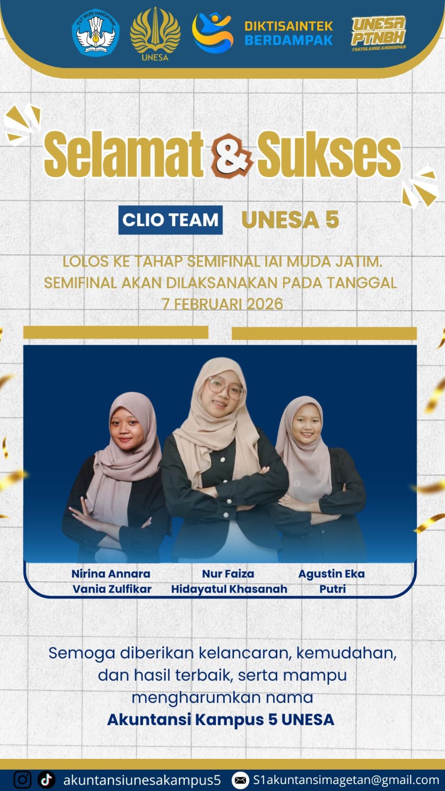 Magetan, Februari 2026 — Prestasi membanggakan kembali diraih oleh mahasiswa S1 Akuntansi UNESA Kampus 5. CLIO Team berhasil lolos ke tahap Semifinal IAI Muda Jawa Timur, sebuah ajang kompetisi bergengsi di bidang akuntansi yang diselenggarakan