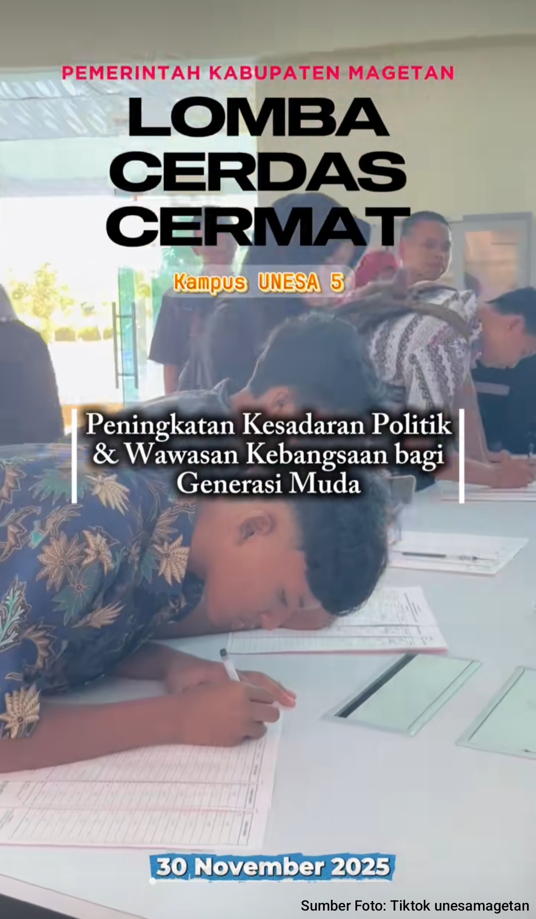 Magetan, 30 Desember 2025 — Pemerintah Kabupaten Magetan bekerja sama dengan UNESA Kampus 5 menggelar Lomba Cerdas Cermat Peningkatan Kesadaran Politik dan Wawasan Kebangsaan bagi siswa-siswi SMA/SMK sederajat. Kegiatan ini berlangsung pada 30 N