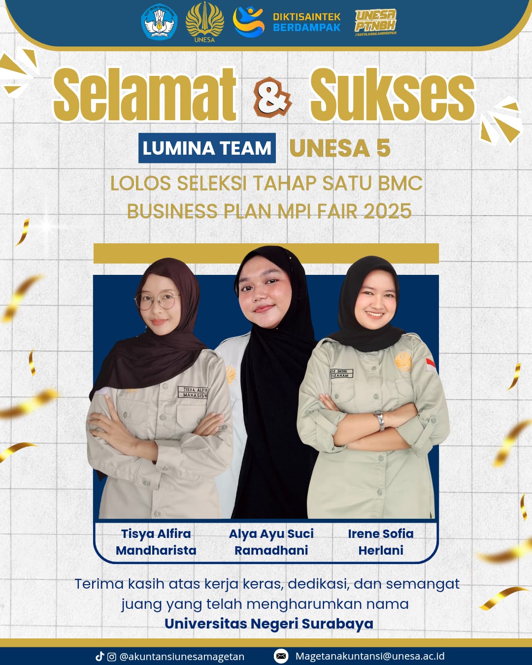 Magetan, 17 November 2025 — Lumina Team, perwakilan mahasiswa S1 Akuntansi Kampus 5 UNESA, resmi lolos Seleksi Tahap 1 Business Model Canvas (BMC) dalam ajang MPI Fair 2025. Dengan inovasi berjudul EcoTex Brick, tim ini ber