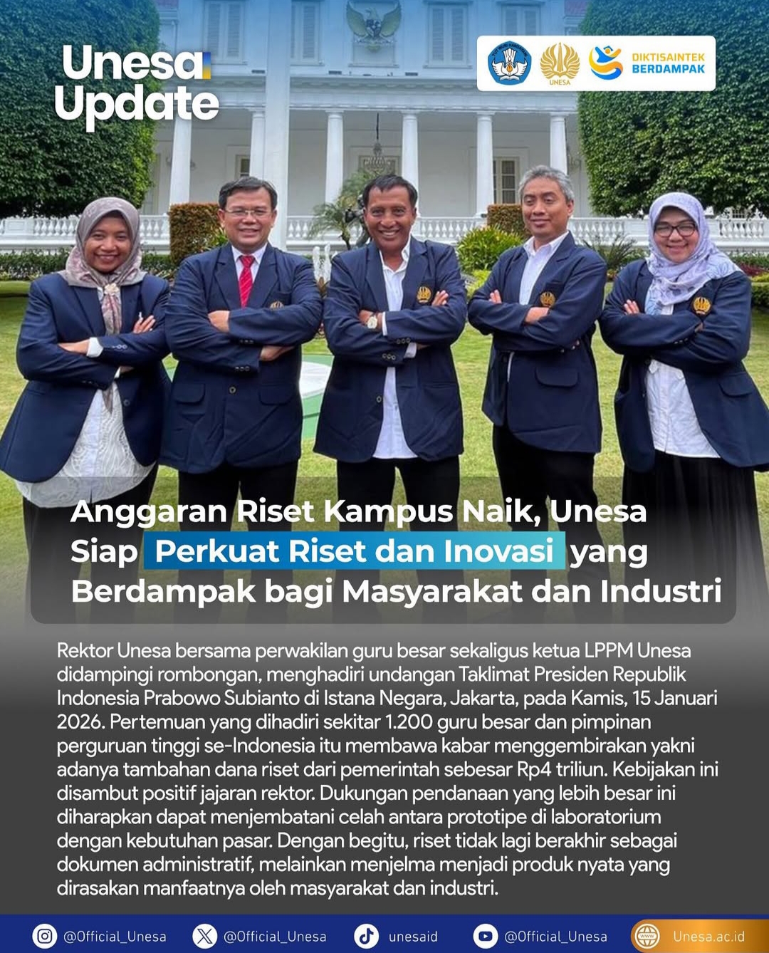 Jakarta, 15 Januari 2026 – Universitas Negeri Surabaya (UNESA) menyatakan kesiapan untuk memperkuat riset dan inovasi yang berdampak bagi masyarakat dan industri seiring dengan adanya peningkatan anggaran riset kampus. Komitmen tersebut disampai