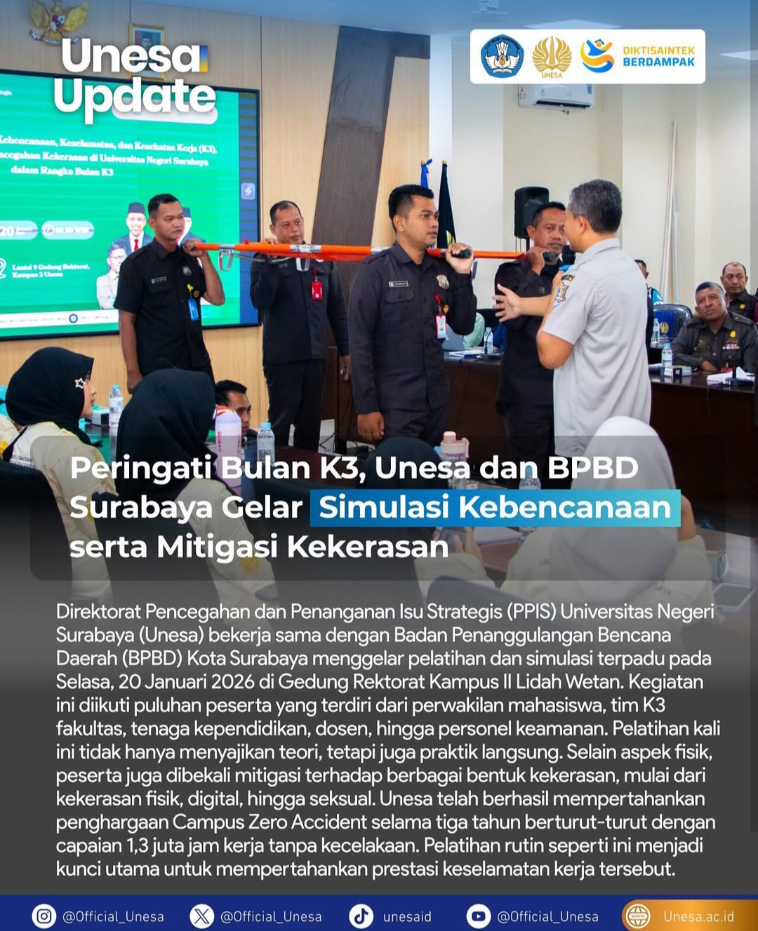 Surabaya, 20 Januari 2026 – Dalam rangka memperingati Bulan Keselamatan dan Kesehatan Kerja (K3), Direktorat Pencegahan dan Penanganan Isu Strategis (PPIS) Universitas Negeri Surabaya (UNESA) bekerja sama dengan Badan Penanggulangan Bencana Daer