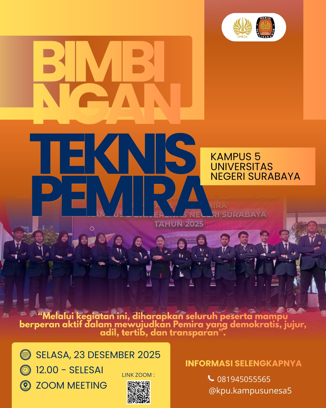 Pemilihan Raya Mahasiswa (Pemira) Kampus 5 Universitas Negeri Surabaya (UNESA) resmi memasuki tahapan pelaksanaan. Panitia Pemira Kampus 5 telah mengumumkan timeline lengkap rangkaian kegiatan Pemira tahun 2025, mulai dari tahapan awal hingga pene