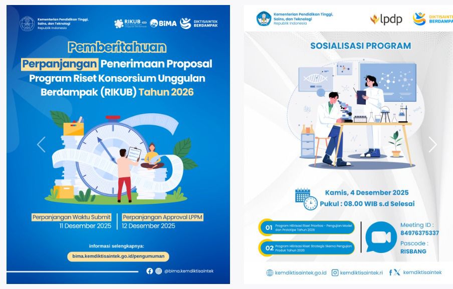 Kementerian Pendidikan Tinggi, Sains, dan Teknologi kembali mengumumkan perpanjangan waktu pengajuan proposal Program Riset Konsorsium Unggulan Berdampak (RIKUB) Tahun 2026. Selain itu, kementerian juga menyelenggarakan sesi sosialisasi program ri