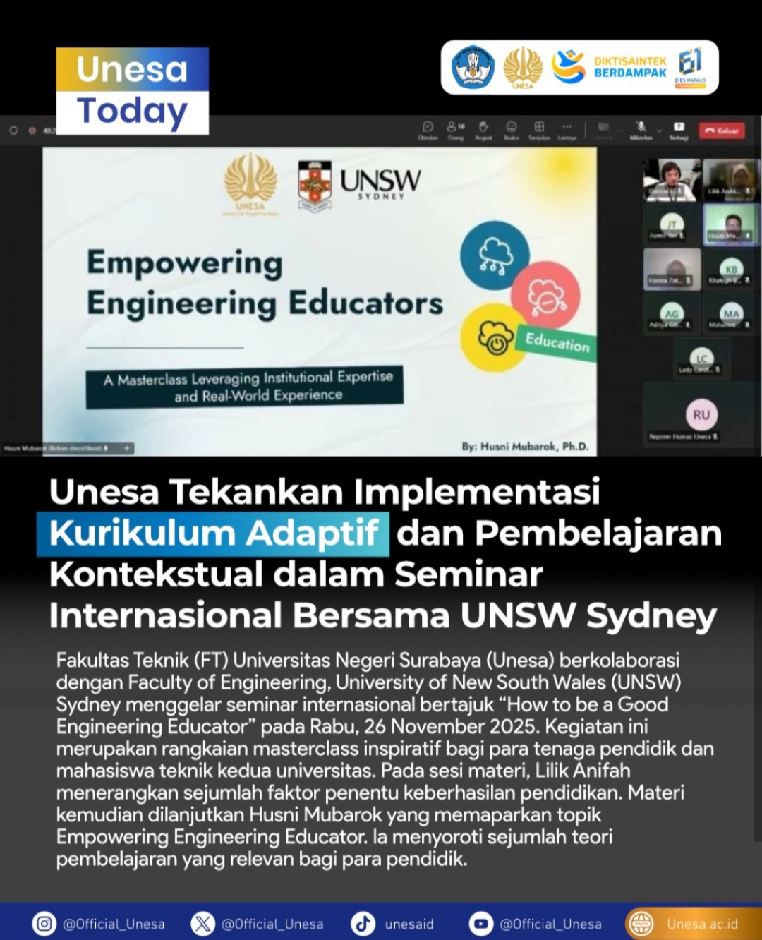 Fakultas Teknik Universitas Negeri Surabaya (UNESA) berkolaborasi dengan Faculty of Engineering, University of New South Wales (UNSW) Sydney dalam penyelenggaraan seminar internasional bertajuk “How to Be a Good Engineering Educator”. Seminar