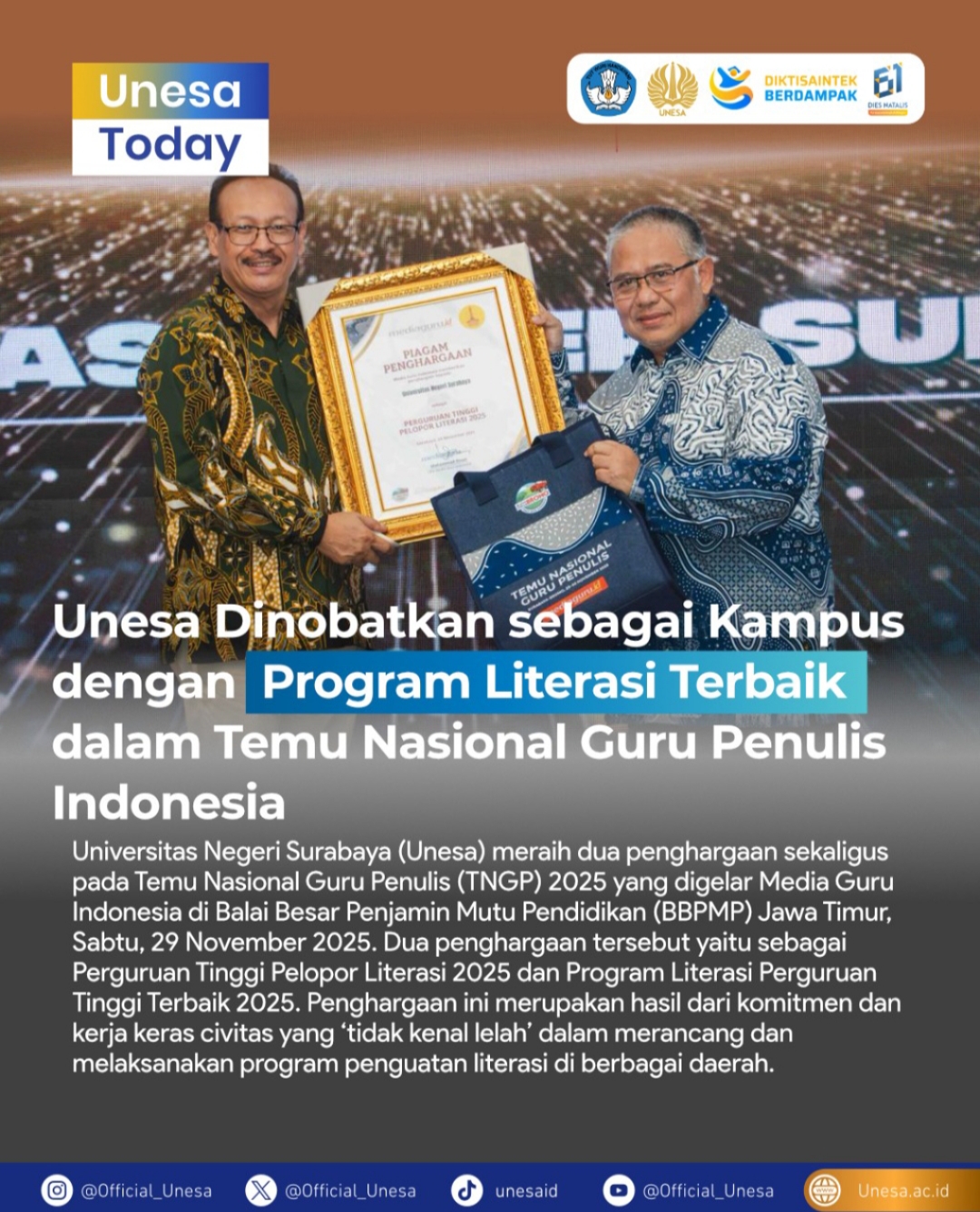 Universitas Negeri Surabaya (UNESA) kembali menorehkan prestasi nasional setelah dinobatkan sebagai kampus dengan Program Literasi Terbaik dalam ajang Temu Nasional Guru Penulis (TNGP) Indonesia 2025. Penghargaan diberikan pada Sabtu, 29 November