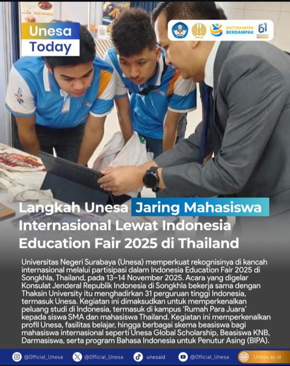 Magetan,27 November 2025-Universitas Negeri Surabaya (Unesa) menegaskan komitmennya di kancah global melalui keikutsertaan dalam Indonesia Education Fair (IEF) 2025 yang digelar di Thaksin University, Songkhla, Thailand, pada 13–14 November 2025